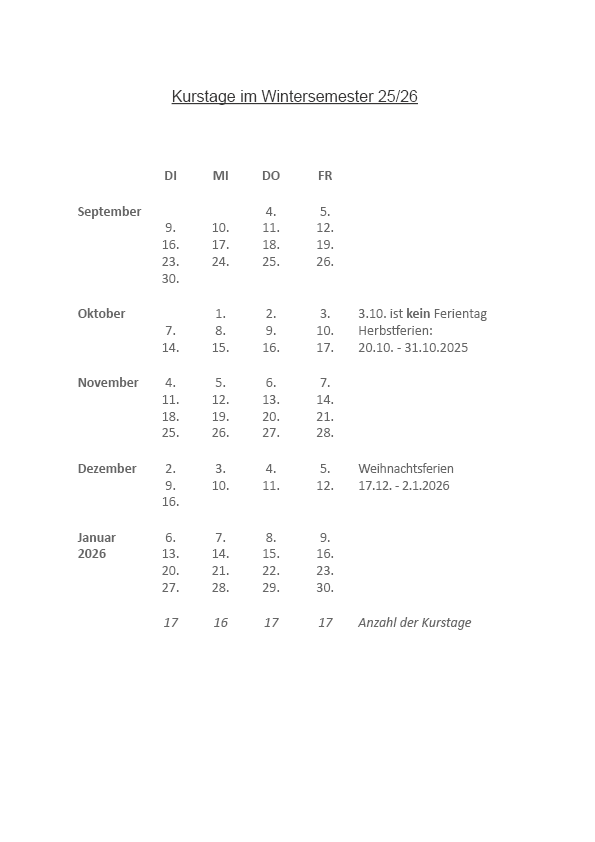 Im Wintersemester verläuft der Kursplan durch den Umzug in die neuen Rämlichkeiten in veränderter Form. Bitte die Termine vom letzten Kurstag im November und vom ersten Kurstag im Januar im eigenen Kalender vermerken. So können überflüssige Anreisen zur Kunstschule vermieden werden.